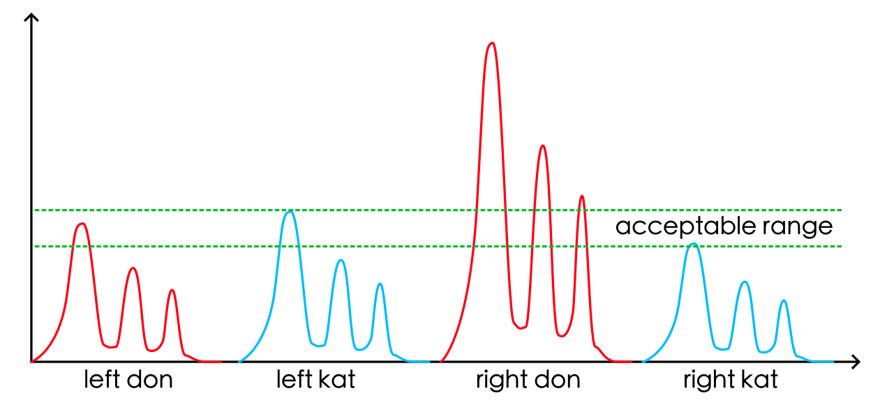Not all piezoelectric sensors are the same, and due to installation errors, the captured signals from the 4 sensors may vary significantly. The sensitivity values are multipliers to normalize the differences. In the following example, the right-don area generates a much higher value than the rest 3, so you can adjust sensitivity to {1.0, 1.0, 0.5, 1.0} to eliminate the issue.